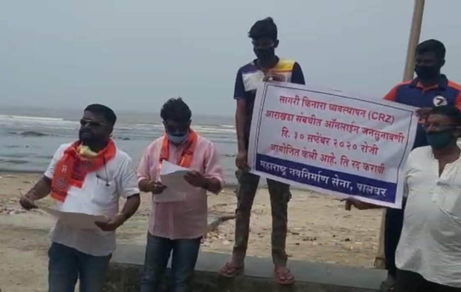 मनोर: सागरी किनारा व्यवस्थापन CRZ संबधीची जनसुनावणी 30 सप्टेंबरला ऑनलाईन घेण्याचे पालघरच्या जिल्हाधिकाऱ्यांनी जाहीर केले आहे. या जनसुनावणीला जिल्ह्यातून मोठ्या प्रमाणात विरोध केला जात आहे. शुक्रवारी मनसे पदाधिकाऱ्यांकडून नांदगाव समुद्र किनाऱ्यावर ऑनलाइन सुनावणी विरोधात आंदोलन करण्यात आले.