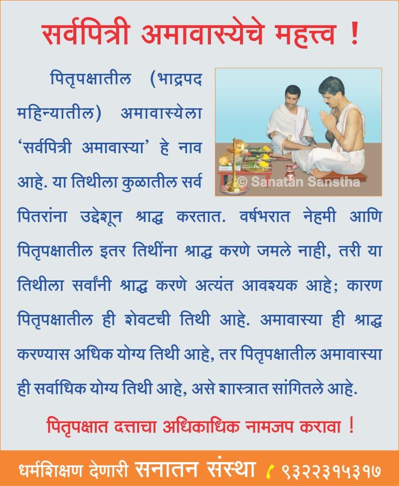 प्रतिवर्षी श्राद्धविधी करणे हा हिंदु धर्मातील एक महत्त्वाचा आचारधर्म असून त्याचे महत्त्व अनन्यसाधारण आहे. पुराणकाळापासून चालत आलेल्या या विधीचे महत्त्व आपल्या ऋषीमुनींनी अनेक धर्मग्रंथांतून लिहून ठेवले आहे. सनातन संस्थेद्वारा संकलित या लेखात सर्वपित्री अमावस्येचे महत्त्व आपण जाणून घेऊया.