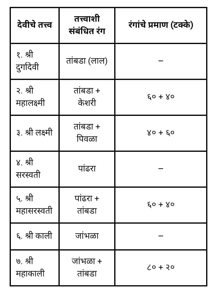 ‘त्या त्या देवीला तिचे तत्त्व जास्तीतजास्त आणि लवकर आकृष्ट करून घेणार्या रंगाचा खण आणि साडी अर्पण केल्याने त्या त्या देवीचे तत्त्व जिवासाठी अल्प कालावधीत कार्यरत होते. पुढील सारणीत काही देवींची नावे आणि त्या देवींचे तत्त्व जास्तीतजास्त अन् लवकर आकृष्ट करणारे रंग (त्या त्या देवीच्या तत्त्वाशी संबंधित रंग) दिले आहेत.