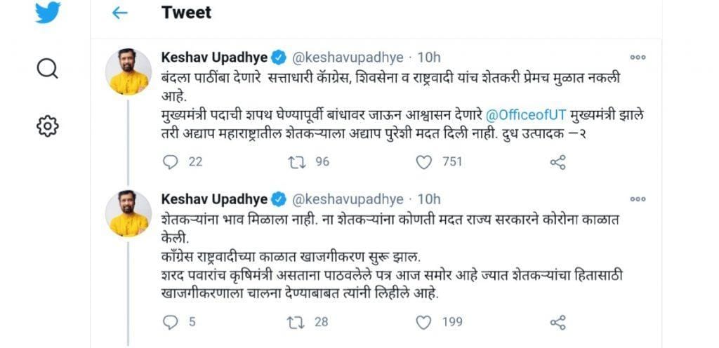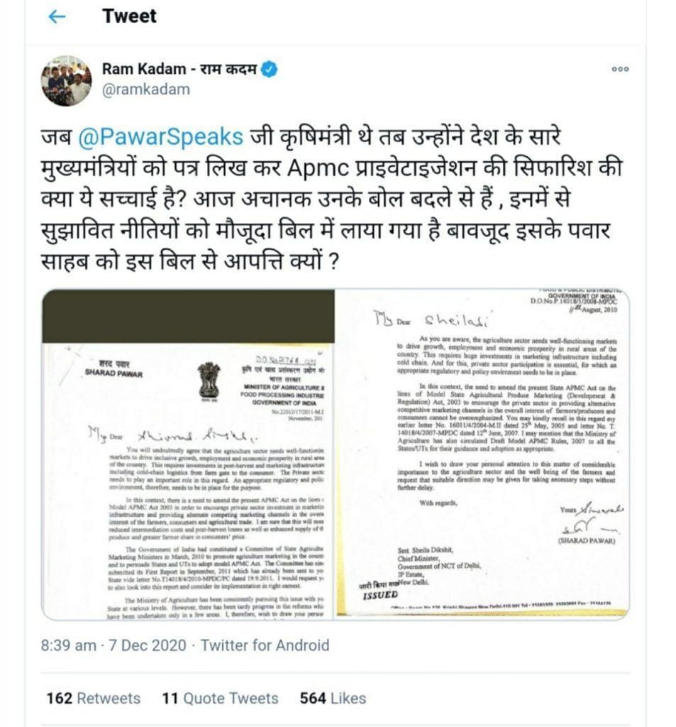 यानंतर भाजप नेत्यांनी यावर ट्विटरवर टीका व्यक्त करून जेव्हा पवार कृषी मंत्री पदाचा कार्यभार सांभाळत होते तेव्हा त्यांनी कृषि कायद्यात मोठ्या बदलाची गरज असे व्यक्त करत दिल्लीतील मुख्यमंत्री शिला शिक्षित यांना पत्र लिहिले होते. अशी टीका भाजप नेत्यांनी पवारांवर ट्विटरच्या माध्यमातून केल्या. मात्र या पत्राचा खुलासा राष्ट्रवादीने केला असून एक कृषिमंत्री म्हणून शरद पवारांचे राज्य कृषी मंडळामध्ये व्यापक सहमती निर्माण करण्यासाठी कायद्याच्या अंमलबजावणीसाठी सल्ले मागितले होते. एपीएमसी कायद्यामुळे शेतकऱ्यांचे होणारे फायदे अनेक राज्यांना समजावले होते. अनेक सरकार अंमलबजावणीसाठी पुढे आली होती. असेस सांगितले.