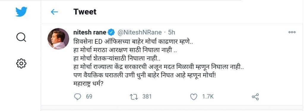 शिवसेना ईडी ऑफिस बाहेर मोर्चा काढणार म्हणे. हा मोर्चा मराठा आरक्षणासाठी निघाला नाही. शेतकऱ्यांसाठी निघाला नाही. व राज्याला केंद्र सरकारची अजून मदत मिळावी म्हणून निघाला नाही. मात्र वैयक्तिक घरातील उणी धुणी बाहेर निघत आहेत म्हणून मोर्चा. भाजप नेते नितेश राणे यांनी असे ट्विट करत महाराष्ट्र धर्म? असा सवाल केला आहे.