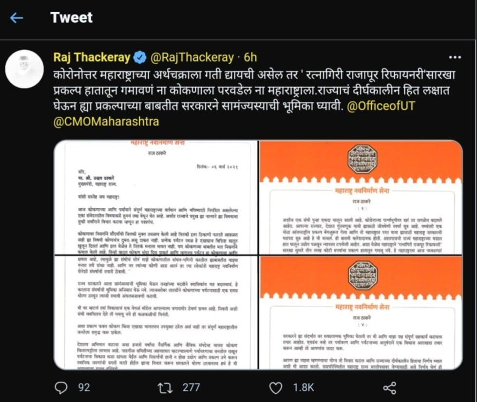 महाराष्ट्र नवनिर्माण सेनेचे अध्यक्ष राज ठाकरे यांनी रत्नागिरी जिल्ह्यात होणाऱ्या रिफायनरी प्रकल्पा बाबत मुख्यमंत्री उद्धव ठाकरे तसेच राष्ट्रवादी काँग्रेस चे अध्यक्ष शरद पवार व विरोधी पक्ष नेते देवेंद्र फडणवीस यांना पत्र लिहिले आहे.
