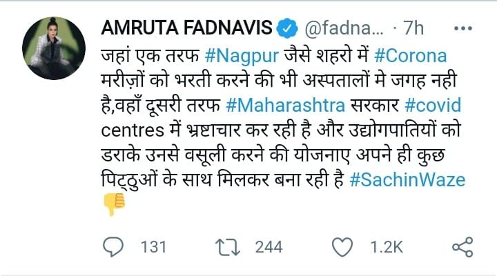 अमृता फडणवीस ट्विट मध्ये म्हणाल्या की, एकीकडे जिथे नागपूर सारख्या शहरामध्ये करोना रुग्णांना हॉस्पिटलमध्ये भरती करण्यासाठी जागा नाही. तर दुसरीकडे महाराष्ट्र सरकार कोविड सेंटरमधुन भ्रष्टाचार करत आहे. तसेच उदयोगपतींना घाबरवुन त्यांच्याकडून वसुली करण्याची योजना आपल्याच काही हस्तकांसोबत मिळून करत आहे. असे ट्विट करून अमृता फडणवीसांनी ठाकरे सरकारवर निशाणा साधला.