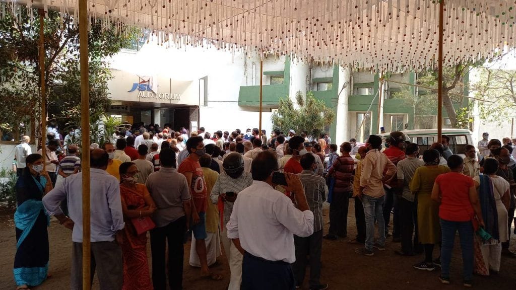 तारापूर औद्योगिक क्षेत्रात असलेल्या टिमा हाँल येथे कोविड लसीकरण पुन्हा सुरू करण्यात आले असून याठिकाणी गुरुवारी 500 नागरिकांचे लसीकरण करणार असल्याचे आरोग्य विभागाने अगोदरच्या दिवशी जाहीर केले. त्यानंतर गुरूवारी 6 मे रोजी पहाटे 3 वाजता पासूनच याठिकाणी नागरिकांनी याठिकाणी येण्यासाठी सुरुवात केली. सकाळी ज्या नागरीकांचा दुसरा लसीकरण आहे त्यांना बोलवण्यात आले होते. तसेच ज्यांचे पहिलेच लसीकरण आहे अशांना दुपारनंतर लसीकरण करण्याचे आरोग्य विभागाने जाहीर करून देखील नागरीकांनी एकच गर्दी याठिकाणी केली. महत्त्वाचे म्हणजे इतर कार्यक्रमाला 25 पेक्षा जास्त गर्दी झाल्यावर कारवाई करणारे प्रशासन एकाच वेळी शेकडो लोकांना गोळा का करते हा प्रश्न देखील उपस्थित केला जात आहे. नागरिकांनी गोंधळ केल्याने आरोग्य विभागाने बोईसर पोलिसांना बंदोबस्त देण्यासाठी सांगण्यात आले होते. मात्र याकडे दुर्लक्ष केल्याने लसीकरण केंद्रावर सकाळी पासून गोंधळ सुरूच आहे.