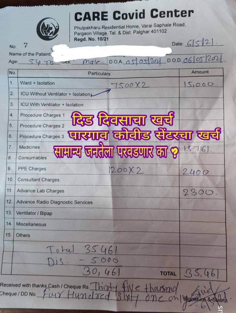 ◾वरई पारगाव रस्त्यावरील केयर कोविड सेंटर मधील प्रकार; कोविड सेंटरचा नियमानुसार बिल आकारणी केल्याचा दावा