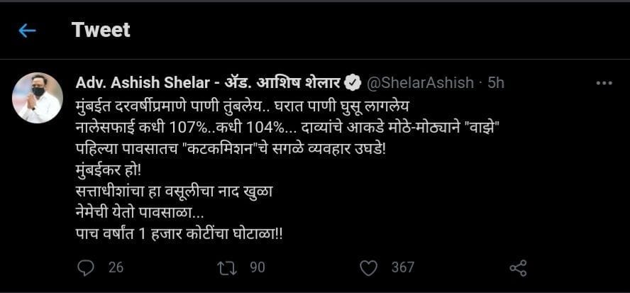 मुंबईत दरवर्षीप्रमाणे पाणी तुंबले आहे. घरात पाणी घुसू लागले आहे. नालेसफाई कधी १०७ टक्क्ये आहे तर कधी १०४ टक्क्येचा दावाचा फोल ठरला. प्रशासनाने काम केलं नाही कंत्राकदराने पळ काढला. सत्ताधाराने कंत्राकदाराच्या केलेल्या कुकृत्यावर पांघरून घातलं. संपूर्ण मुंबईमध्ये दर वर्षाला ७० ते १०० कोटी रुपये केवळ नालेसफाईसाठी. ५ वर्षात ५०० कोटी रुपये ते सोडून छोटे नाले व स्टॉर्म वॉटर दुरुस्ती असो व पाणी तुंबू नये म्हणून दरवर्षी १०० कोटी प्रमाणे ५ वर्षाचे अधिकचे ५०० कोटी म्हणजे ५ वर्षात १ हजार कोटींचा खर्च पण मुंबईकारांच्या नशिबी केवळ तुंबलेलं पाणी घरात घुसण्याची स्थितीत आहे. जिथे पाणी तुंबत नव्हतं तिथेही पाणी तुंबलेलं आहे. असे देखील शेलार यांनी सांगितले.