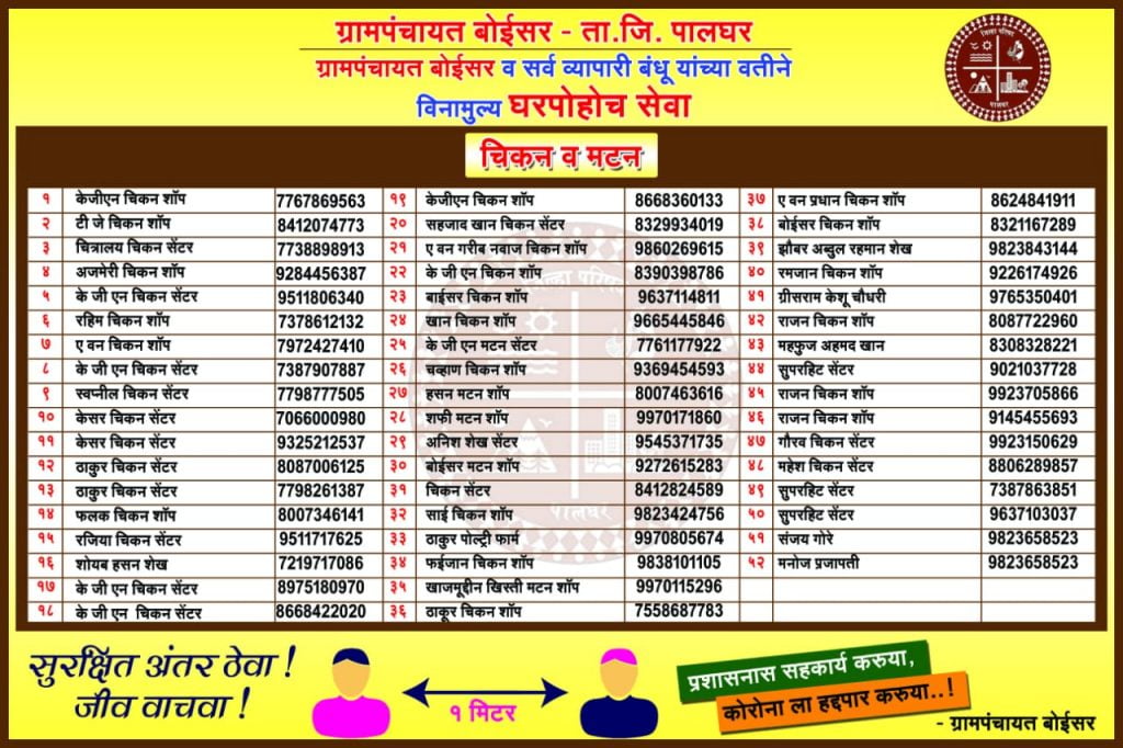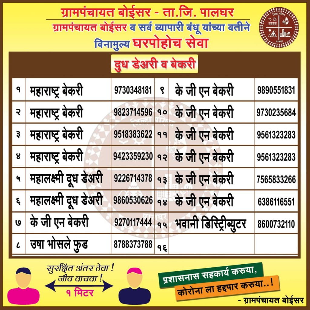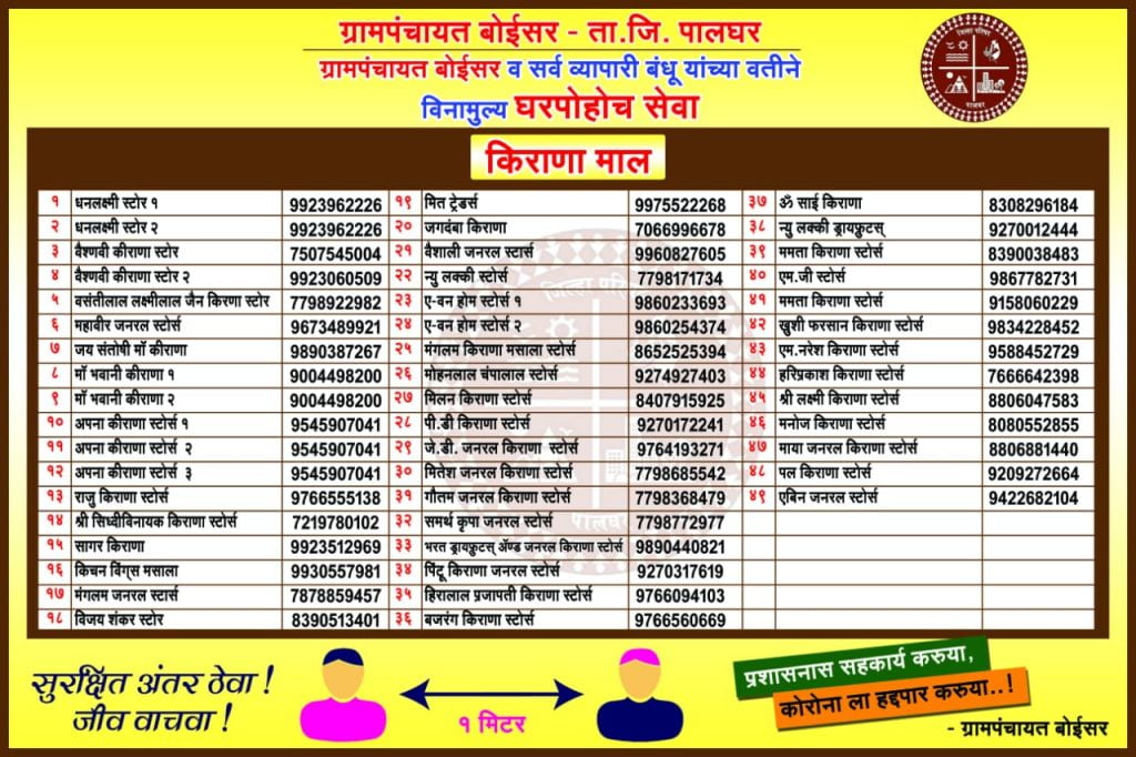 बोईसर ग्रामपंचायतीने नागरीकांन साठी घरपोच देण्यात येणारी सेवा यामुळे बोईसर मुख्य रस्त्यावर नागरीकांची होणारी रेलचेल कमी होण्यासाठी मदत होणार आहे. ग्रामपंचायतीने घेतलेल्या निर्णयाचे नागरीकांन कडुन देखील स्वागत केले जात असुन खरेदी साठी होणारी नागरीकांची धावपळ बंद होणार आहे. ग्रामपंचायतीने बोईसर हद्दीतील 48 किराणा दुकान, 52 चिकन मटन दुकानदार, 7 होलसेल, 120 भाजी विक्रेते व दुध विक्रेते अशांना पास देण्यात आले आहेत. नागरीकांना विक्रेत्यांचे संपर्क क्रमांक देण्यात आले असुन फोन करून जीवनावश्यक वस्तू घरपोच नागरीक मागवून घेताना दिसत आहेत.