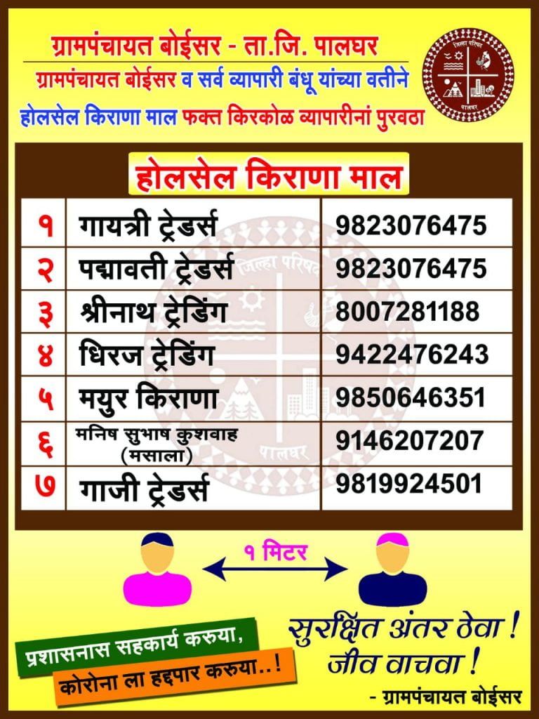 बोईसर परिसरात असलेली देशातील सर्वात मोठी औद्योगिक वसाहत व अणुऊर्जा प्रकल्प यामुळे याठिकाणी लोकसंख्या देखील मोठी आहे. करोना ला लढा देण्यासाठी प्रशासन सज्ज झाले असले तरी नागरीक देखील जीवनावश्यक वस्तू खरेदी करण्यासाठी मोठ्या प्रमाणात गर्दी करतात. काही दिवसापूर्वी ग्रामपंचायतीने सर्कस मैदानात भाजी मंडई भरवली होती. परंतु बोईसर परिसरातील अनेक भागातुन एकाचवेळी नागरीकांनी मोठी गर्दी केल्यामुळे परिस्थिती नियंत्रणा बाहेर गेलेली. संचारबंदी असली तरी जीवनावश्यक गोष्टी नागरीकांना वेळेवर उपलब्ध करून देण्यासाठी बोईसर ग्रामपंचायत सज्ज झाली आहे. यामध्ये दुध, किराणा, चिकन, मटण, अंडी, भाजी अशा जीवनावश्यक गोष्टी लोकांना घरपोच मिळाव्यात याठिकाणी विक्रेत्यांना एकत्र करून त्यांना ग्रामपंचायती कडुन पासेस देण्यात आले आहेत.