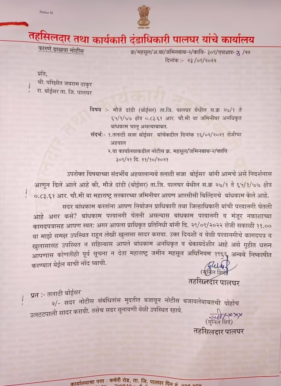 बोईसर भंडारवाडा भागात मुख्य रस्त्यालगत दिपक ठाकूर यांची बेकायदेशीर इमारत उभी असताना देखील त्याकडे प्रशासनाने दुर्लक्ष केले. निवडणूक कार्यकाळात इतरांना नोटीसा काढणारे पालघर तहसीलदार यांनी मात्र ठाकूर यांच्या इमारतीवर मेहरबानी दाखवून दिली. विशेष म्हणजे याच अनधिकृत इमारती मध्ये राहत असलेला बोईसर ग्रामपंचायत कर्मचारी परिक्षत ठाकूर यांनी बोईसर दांडीपाडा भागात सरकारी जागेवर अनधिकृत इमारतीचक बांधकाम केले आहे. वर्षभरापूर्वी याबाबत स्थानिक तलाठी व मंडळ अधिकारी यांनी कारवाई बाबत पालघर तहसीलदार यांच्या कडे अहवाल सादर केला होता. मात्र संधी शोधून कारवाई करणारे तहसीलदार यांनी कोणत्याही प्रकारची कारवाई याठिकाणी केली नव्हती. मात्र ग्रामपंचायत निवडणूकीत या इमारतीला नोटीस काढून राजकीय तडजोड ठाकूर यांची शिंदे गटासोबत झाल्याची चर्चा बोईसर मध्ये जोरदार सुरू आहे.
