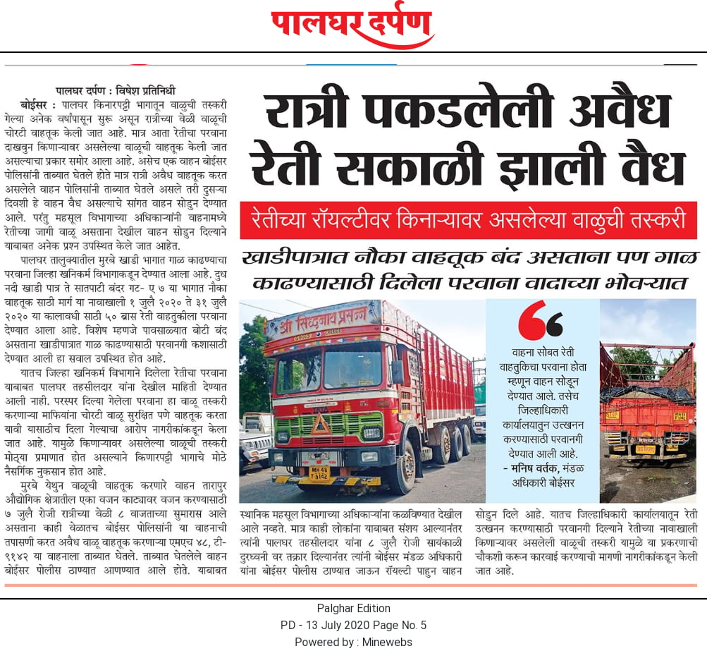 पालघर किणारपट्टी भागातून रात्रीच्या वेळी वाळुची तस्करी गेल्या अनेक वर्षांपासून सुरू आहे. रेतीचा परवाना दाखवुन किनाऱ्यावर वाळूची वाहतूक केली जात असल्याचा प्रकार आठवडा भरापूर्वी समोर आला होता. बोईसर पोलिसांनी ताब्यात घेतलेला बेकायदेशीर वाळूची तस्करी करणारा ट्रक दुसऱ्या दिवशी वाहतुक परवाना असल्याचे सांगत सोडुन दिला होता. मात्र याबाबत सडेतोड वृत्त पालघर दर्पणने प्रसिद्ध करून वाळूची होणारी तस्करी उजेडात आणली होती. मुरबे खाडी पत्रातून गाळ काढण्यासाठी खनिकर्म विभागाकडून हातपाटीद्वारे रेती उत्खनन व वाहतूक परवाना अनिल पाटील यांना देण्यात आला होता. दुध नदी खाडी पात्र ते सातपाटी बंदर रेती गटातील नौका वाहतूक मार्ग सुकर करण्यासाठी 1 जुलै ते 31 जुलै 2020 या कालावधी साठी 50 ब्रास रेती वाहतुकीला परवाना देण्यात आला होता. पावसाळ्यात बोटी बंद असताना खाडीपात्रात गाळ काढण्यासाठी परवानगी कशासाठी देण्यात आली हा सवाल उपस्थित करण्यात आला होता.