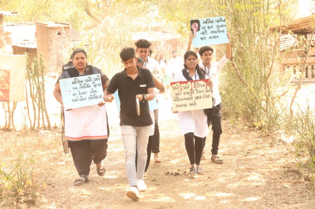 ग्रामीण भागात आजही मासिक पाळी दरम्यान कपड्याचा वापर केला जातो. आरोग्याविषयी योग्य मार्गदर्शन मिळत नसल्याने आदिवासी भागात याबाबत जनजागृती व्हावी यासाठी विद्यार्थांनी पुढाकार घेतला आहे. मासिक पाळी दरम्यान कपड्याऐवजी सॅनिटरी पॅड वापरणे काळाजी गरज असल्याचे विद्यार्थ्यांनी पथनाट्याच्या माध्यमातून महिलांना पटवून दिले. शिक्षकांच्या मार्गदर्शनाने मराठी पत्रकारिता आणि जाहिरात माध्यमातील विद्यार्थ्यांनी या सामाजिक उपक्रमामध्ये हिरीरीने सहभाग घेतला. ‘या रे या सारे या, जनजागृती करुया, एकमेकांना सांगुया, सॅनिटरी पॅड वापरूया’ अशा घोषणा करत विद्यार्थ्यांनी घरोघरी जाऊन पाड्यातील महिलांना एकत्र आणले होते.